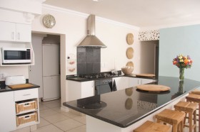The modern and well-equipped kitchen features ample workspace, gas hobs, electric oven, microwave oven and two large fridge/freezer combinations for storing freshly caught fish from your very own slice of the Indian Ocean or meat for your braai with a view.